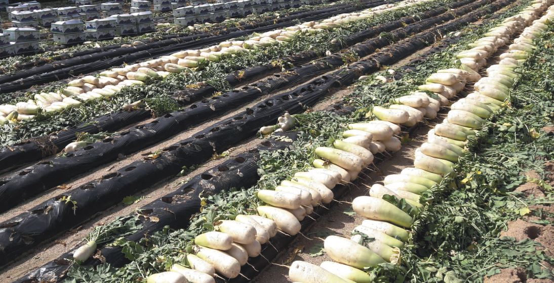 배추와 함께 김장 김치의 메인 재료인 무입니다. 무는 뿌리를 수확하는 채소이므로 밭에 직접 씨앗을 파종하는 것이 좋습니다. 무를 심을 밭은 깊이 갈아서 흙을 부드럽게 해주고 뿌리의 성장에 방해가 되는 돌 등을 골라주어 무가 곧게 자랄 수 있도록 해주는 것이 좋습니다.