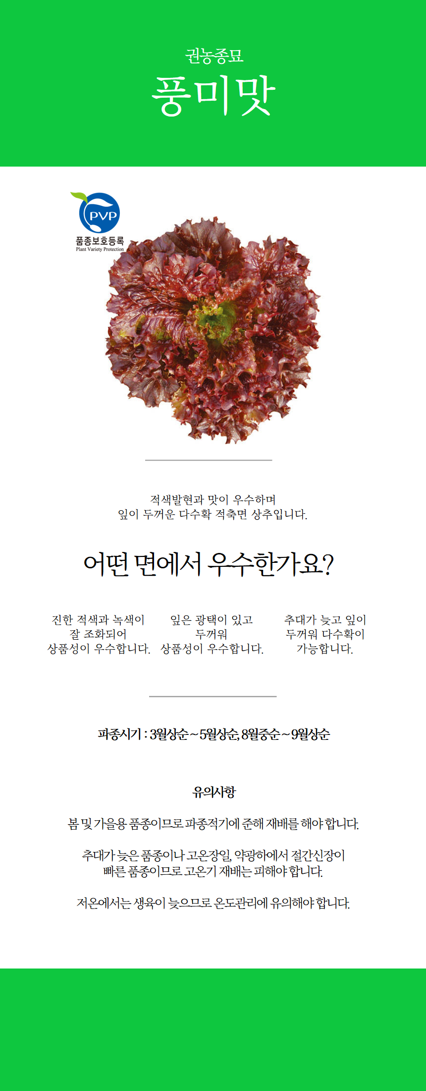 - 봄 및 가을용 품종이므로 파종적기에 준해 재배를 해야 합니다.