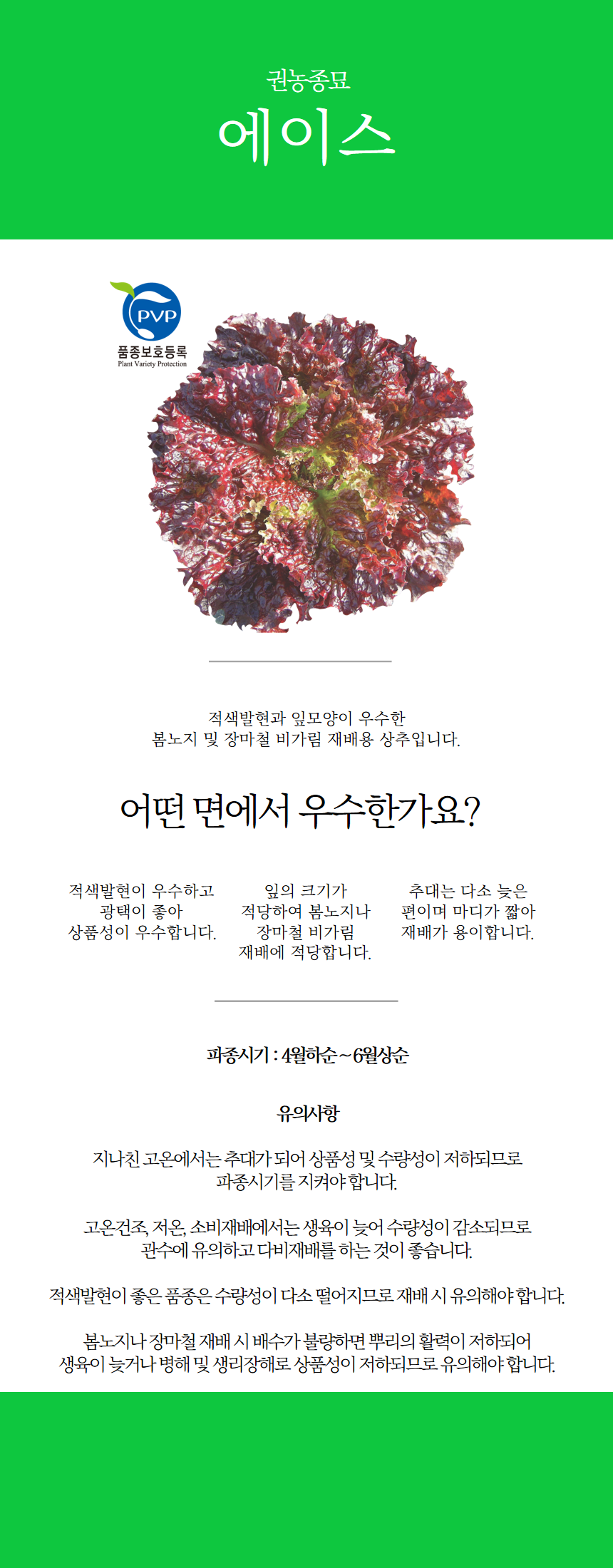 - 적색발현이 좋은 품종은 수량성이 다소 떨어지므로 재배시 유의해야 합니다.