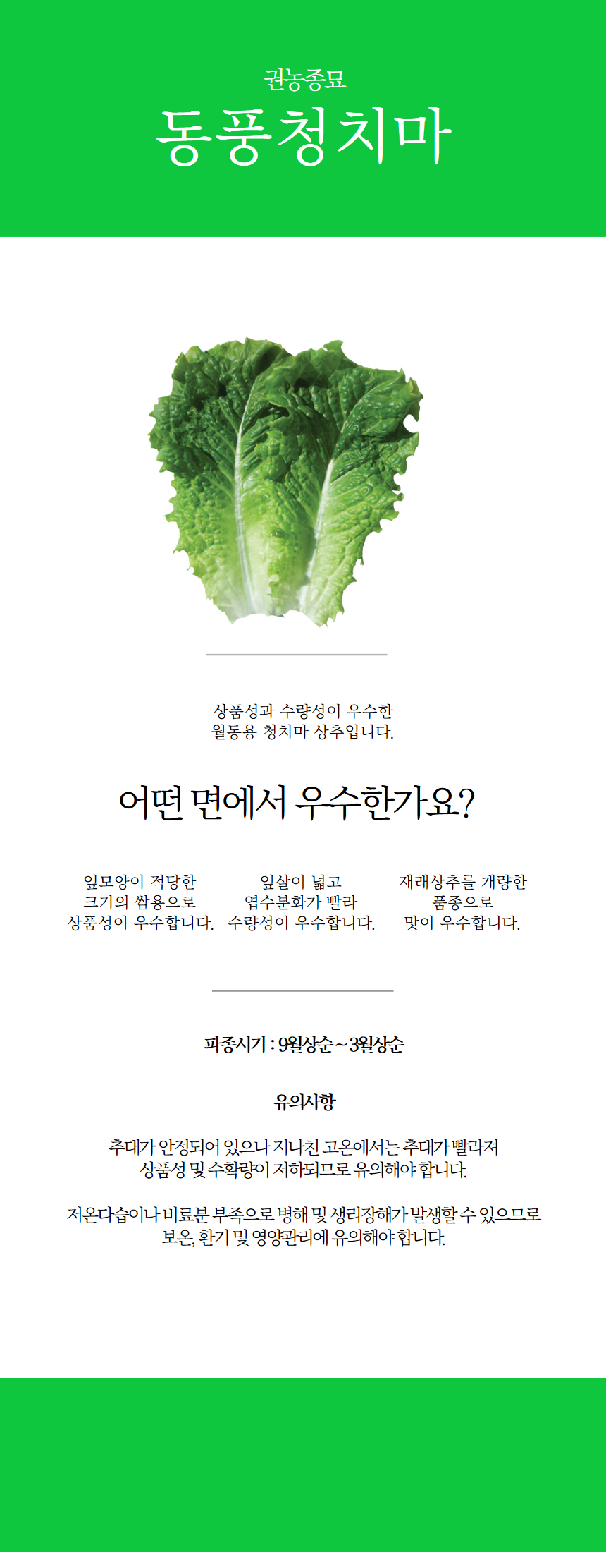추대가 안정되어 있으나 지나친 고온에서는 추대가 빨라져 상품성 및 수확량이 저하되므로 유의해야 합니다.