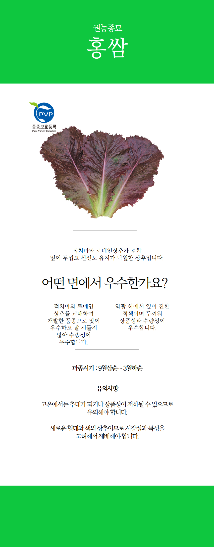적치마와 로메인 상추를 교배하여 개발한 품종으로 맛이 우수하고 잘 시들지 않아 수송성이 우수합니다.